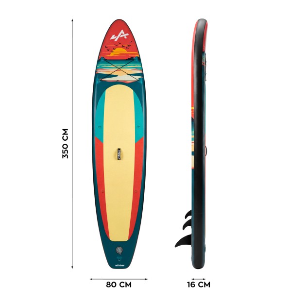 - Deska Stand Up Paddle Athler sprawdzi się zarówno wtedy, gdy stawiasz pierwsze kroki, jak i gdy jesteś bardziej zaawansowanym użytkownikiem. Szerokość 80 cm i długość 350 cm powodują, że to idealny wybór do relaksującego zwiedzania akwenów i aktywnego spędzania wolnego czasu.