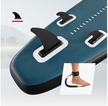 3 płetwy – gwarantują maksymalną stabilność i bezpieczeństwo, szczególnie dla początkujących. Centralna płetwa odpowiada za utrzymanie kierunku i łatwiejsze trzymanie kursu, natomiast płetwy boczne wspierają skręcanie oraz kontrolę na wodzie. Dzięki temu deska zachowuje się przewidywalnie, a ryzyko utraty kontroli zostaje znacząco zredukowane.