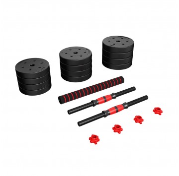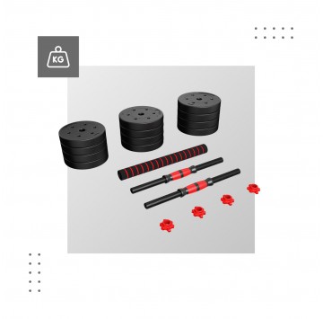 - W skład zestawu wchodzą dwa gryfy, łączenie, cztery zaciski i 12 obciążeń: 4 talerze x 2kg, 4x1.25 kg oraz 4x1.5 kg.