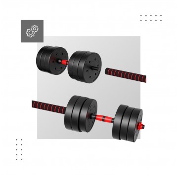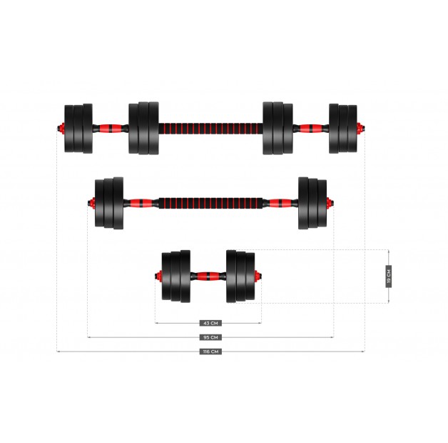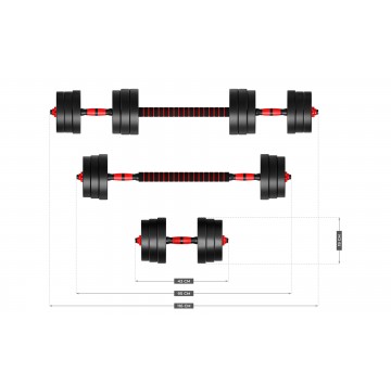 - Dzięki specjalnemu łączeniu, zestawu używać możesz na 3 różne sposoby: jako sztangę, dwa oddzielne hantle lub hantle połączone gryfem.