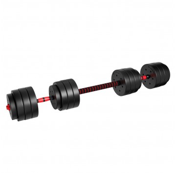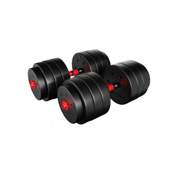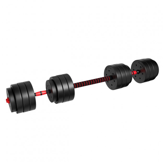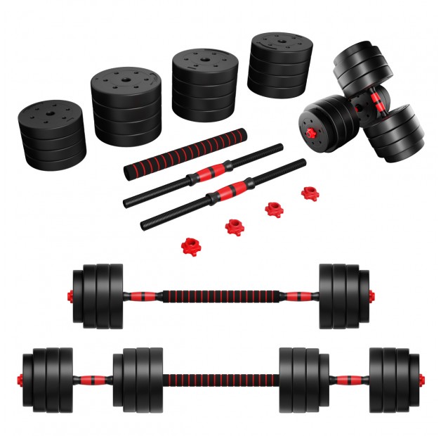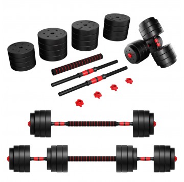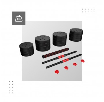 - W zestawie: 2 gryfy (0,5 kg każdy), łączenie, 4 zaciski, 16 talerzy obciążeniowych - 1,25 kg ( 4 sztuki), 2,5 kg ( 4 sztuki), 3 kg (8 sztuk)